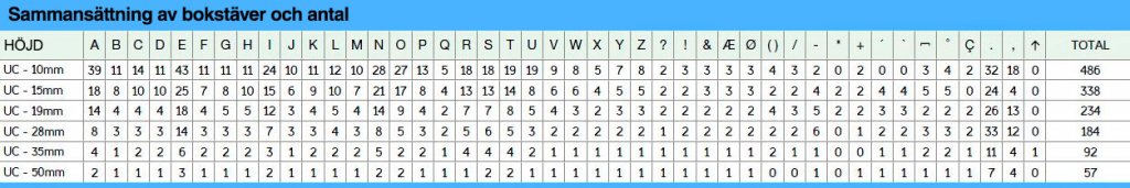 Varje bokstavspaket innehåller fler vokaler än konsonanter och fler av de bokstäver som används mer än de bokstäver som inte används lika ofta. Bokstavspaketen innehåller de svenska bokstäverna Å, Ä, Ö och tecken för att kunna bygga ihop till dom. Alla bokstäver är versaler i detta paket.