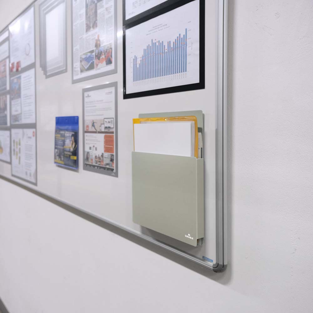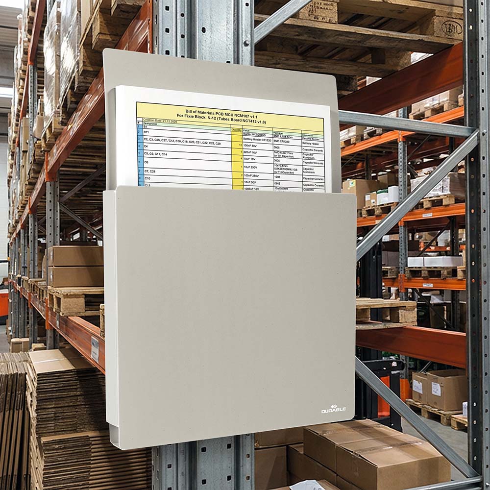 Tillverkad av återvunnen plast kombinerar den både hållbar lösning med praktisk funktion. Kapaciteten gör det möjligt att förvara flera dokument samtidigt och detta gör den idealisk för informationsblad, broschyrer och formulär i miljöer som kontor, verkstad, lager, butiker m.m.