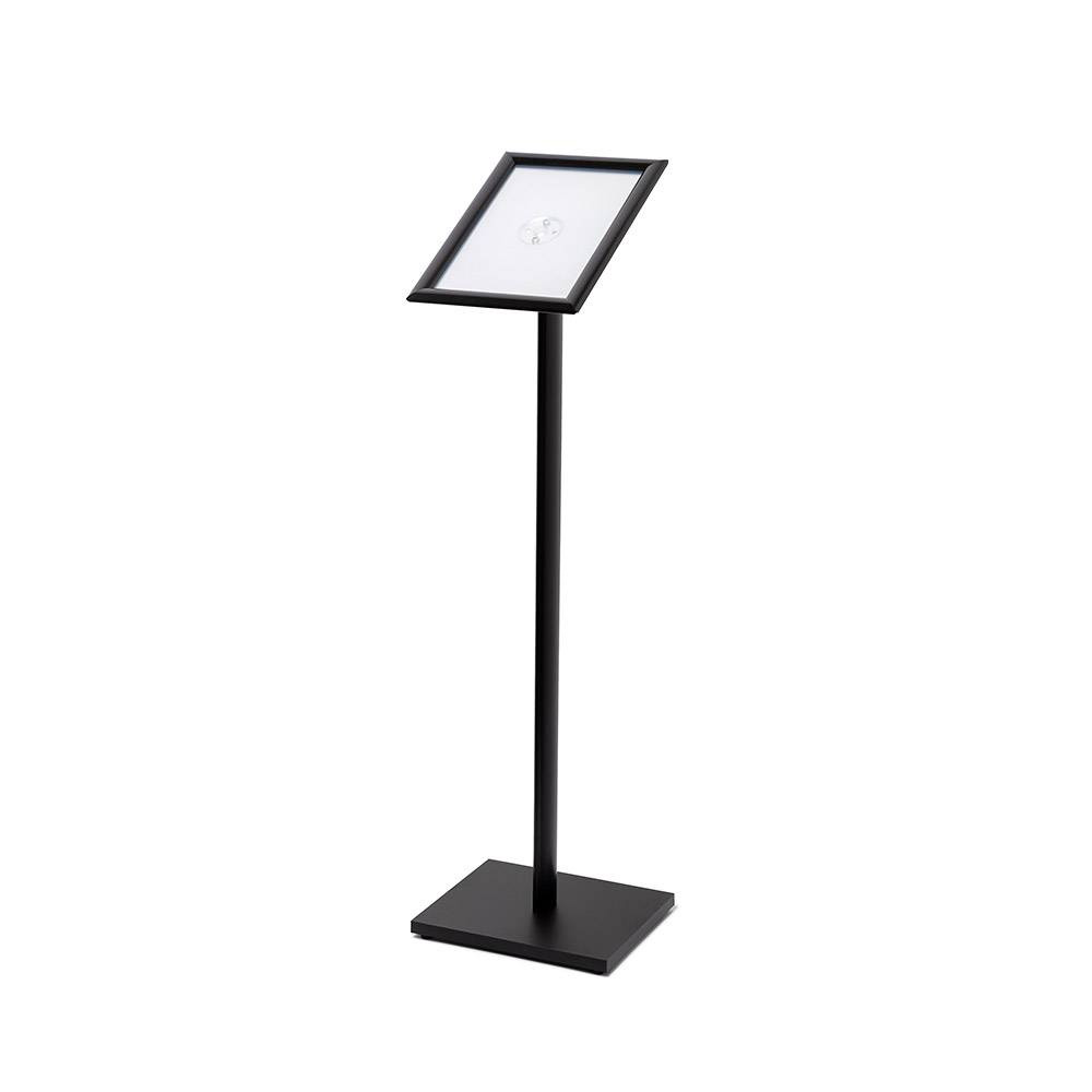 Detta stilrena och prisvärda informationsställ i svart utförande är designat för professionella miljöer som restauranger, kontor, köpcentrum, bilhallar och butiker. Med sin stabila basplatta i stål och flexibla A4-snäppram är det enkelt att presentera information, menyer, kampanjer eller reklam.