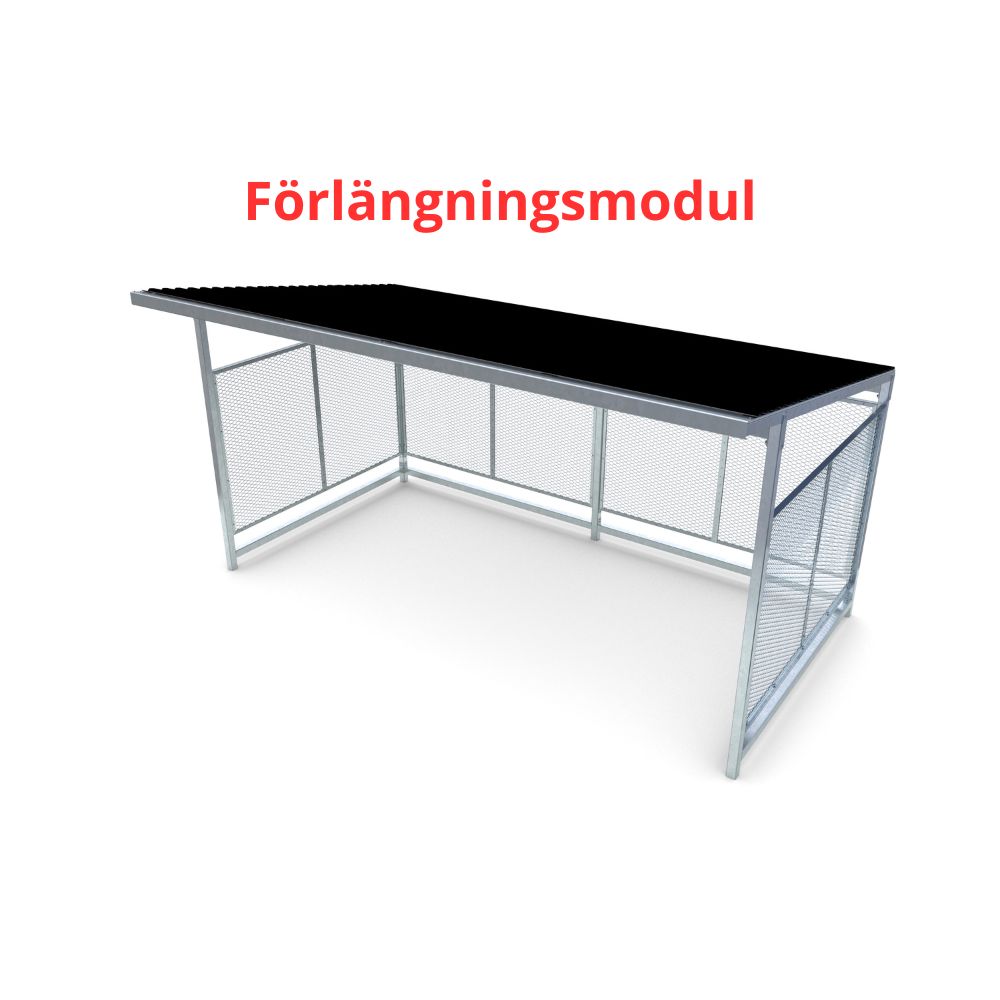 Förlängningsmodul till cykelgarage Nova med rakt plåttak ökar dess mått och ger utrymme för att bekvämt rymma fler cykelparkeringar eller anpassa utrymmet efter specifika behov.