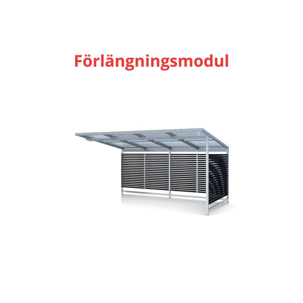 Förlängningsmodul till cykelgarage Stella med rakt tak och kanalplast ökar dess mått och ger utrymme för att bekvämt rymma fler cykelparkeringar eller anpassa utrymmet efter specifika behov.