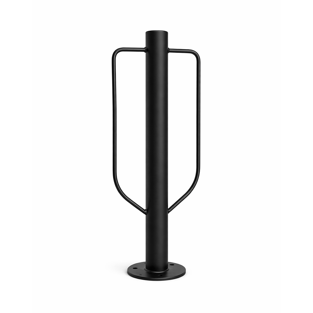 Konstruktionen är tillverkad i pulverlackerat stål och passar bra vid entréer, innergårdar och företagslokaler där ordning och säker förvaring är viktigt. Den vertikala formen gör att pollaren tar begränsad plats samtidigt som den är lätt att använda.
