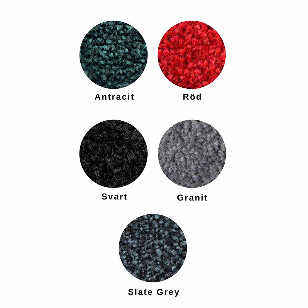 Denna torkmatta är av riktigt hög kvalitet och är både tvättbar och mycket tålig. Det kraftiga nylongarnet som är infärgat är färgbeständigt och behåller sig färg både efter tvätt och ljus. För att mattan ska avledas från statisk elektricitet blandas kolfibertrådar in i mattan. Baksidan på denna entrematta är av tjock nitrilgummi för att ligga stadigt på golvet och för att smuts och väta ska stanna i mattan är den även förstärkt med en kant runt mattan.