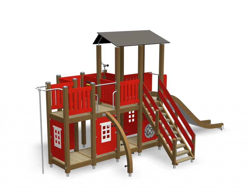 Bondgården är en spännande och rolig lekställning som är utrustad med trappa, rutschkana, brandstege och en kikare. En perfekt lekställnig som har plats för många lekande barn, där de kan fantisera och leka rollspel att de är brandmän som ska rädda någon på lekplatsen och snabbas ned vinner! Bondgården lekställning kan kombineras med gungor, karuseller och sandlåda till en lekpark, innergården på en BRF eller till en skolgård där många barn vill leka.