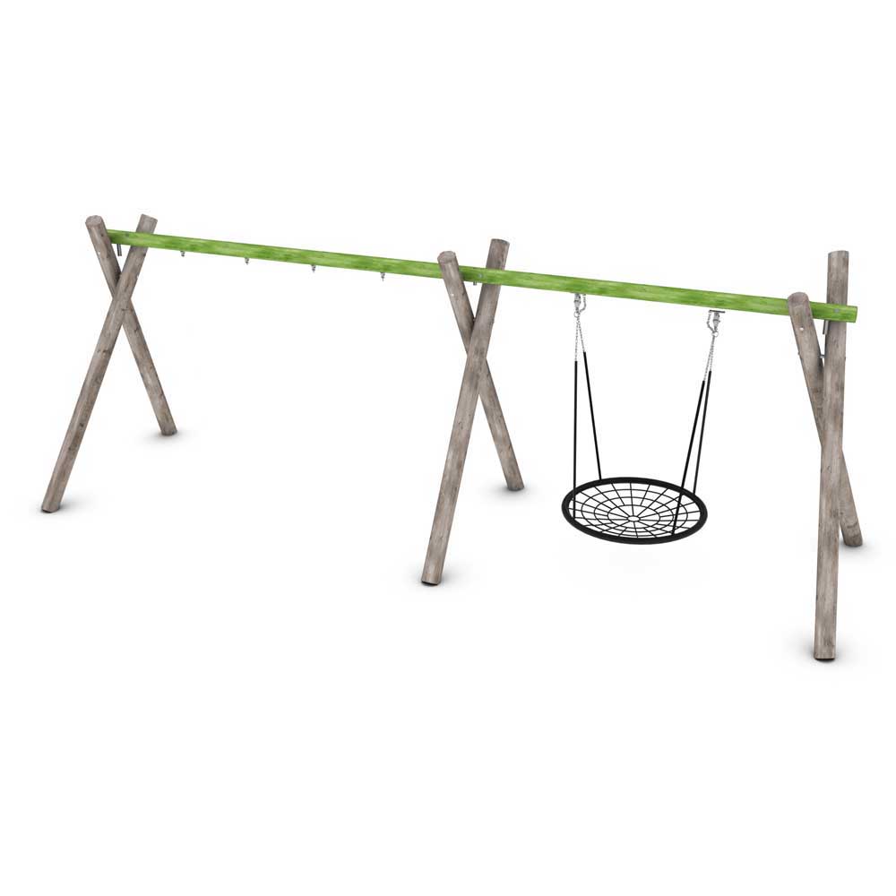 En stor gungställning plus en fågelbosgunga (Ø125 cm). Geliega gungställning har en naturinspirerad design med robusta trästockar som ställning och inklusive en kompisgunga. Komplett gungställning med totalt 3 gungplatser där två extra gungor köps separat efter behov.