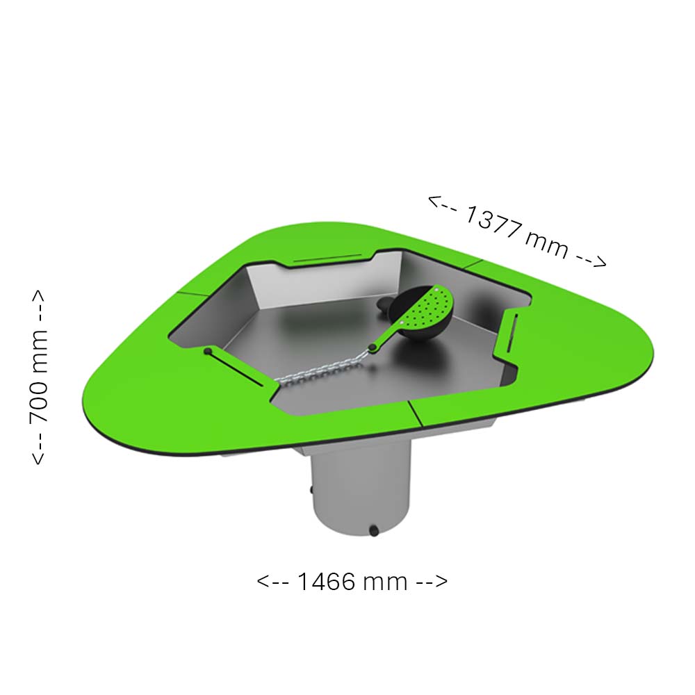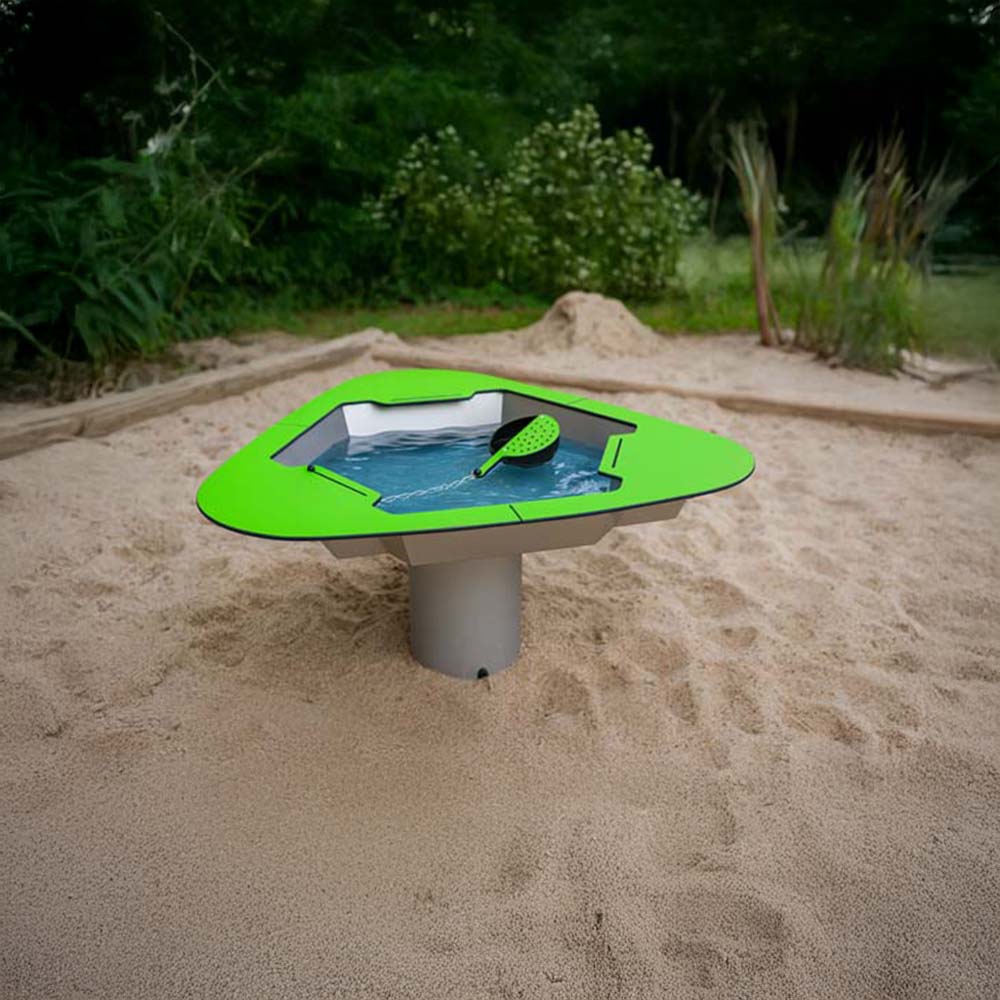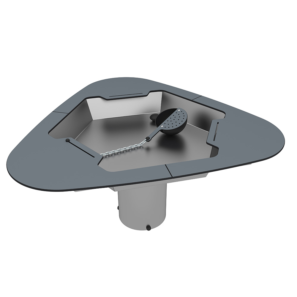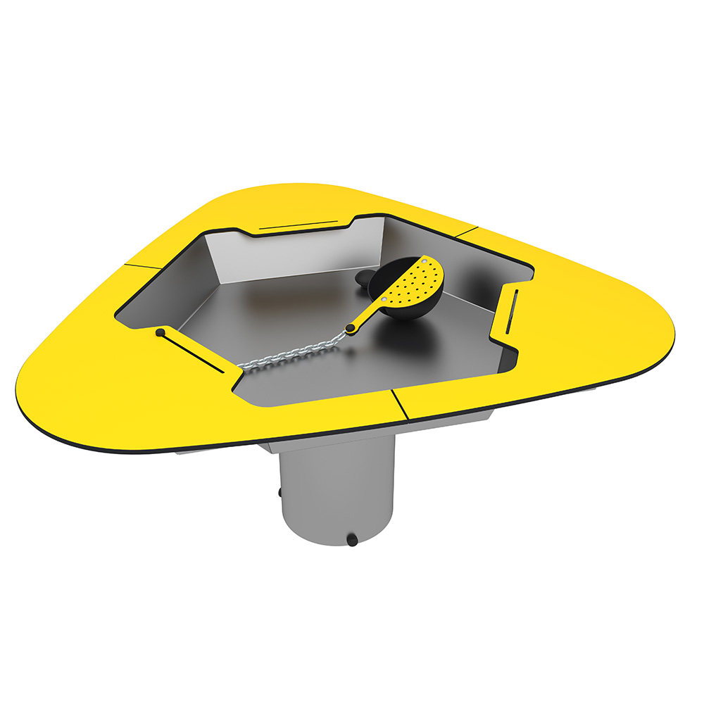 Skopan som är fäst i en kedja ger barnen möjlighet att hälla, ösa och experimentera – perfekt för både ensamlek och samspel. En sil i ena halvan av skopan förhöjer variationsmöjligheterna. Tack vare ventilen töms leken snabbt och enkelt efter användning. En hållbar produkt i rostfritt stål och väderbeständig HPL.