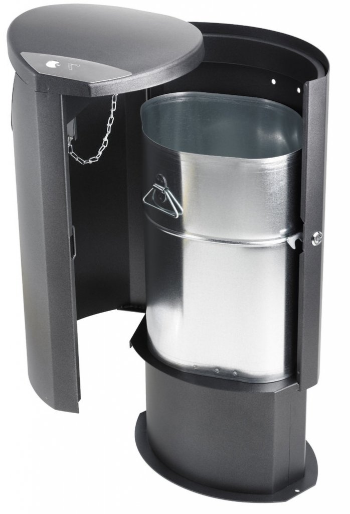 Papperskorg Ellipse 100 är modern och innovativ skräpkorg. Den gångjärnsförsedda dörren öppnas i sidled vid tömning. Ett välbyggt ellipsformat avfallskärl i galvaniserat pulverlackat stål. Tidlös och funktionell design och många arkitekter ritar in denna papperskorg i sina byggbeskrivningar då den anses mycket modern i sitt utförande. Denna papperskorg är tillverkad med omtanke på en enkel och framför allt effektiv tömning samt motståndskraft emot vandalism och annan mekanisk stress. Perfekt anpassad öppning som är enkel att använda och som håller fåglar samt regn borta på ett väl fungerande sätt. Framdörren har gångjärn och kan låsas. Insats för säkert och enkel tömning.