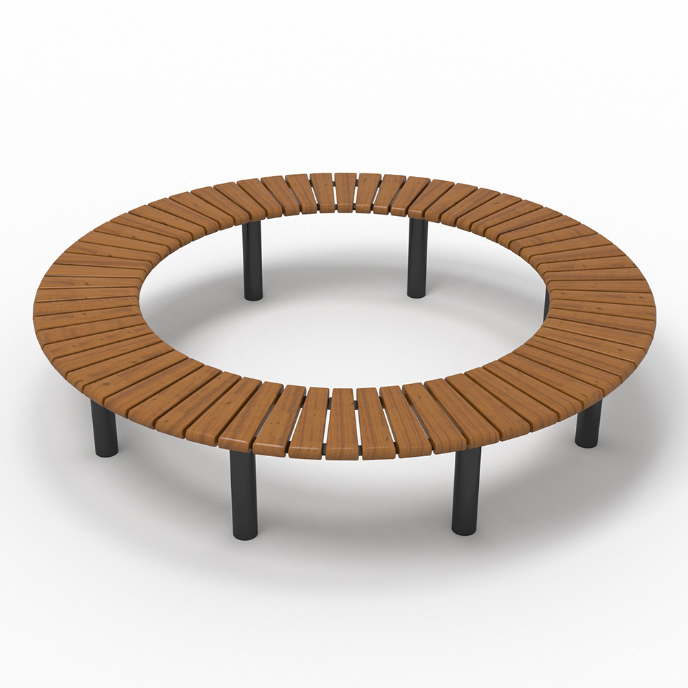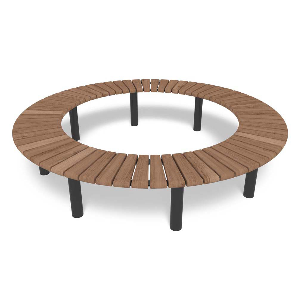 Sofiero Parkbänk Svängd 360° Trädbänk rund bänk Trädbänk värmebehandlat trä och svart Trädbänk värmebehandlat trä och galv Trädbänk för skola och torg Rund bänk till offentlig miljö Sofiero - Trädbänk Ø1400 mm - Platsgjutning