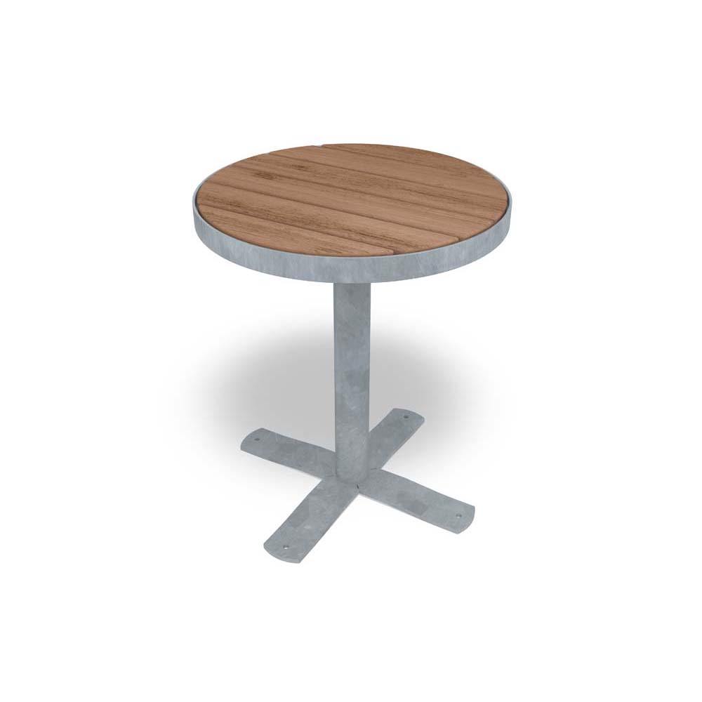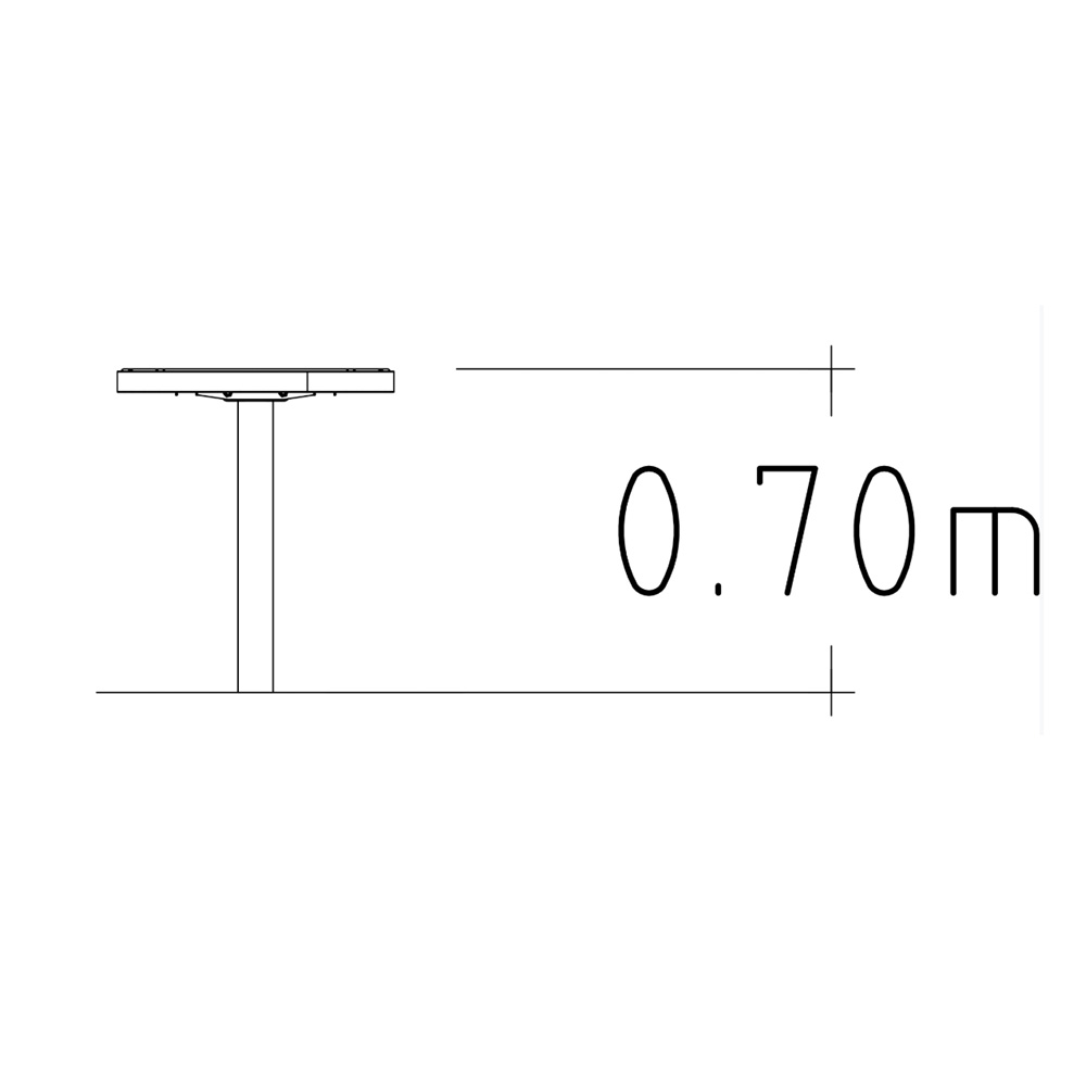 Bordet monteras ovan mark med kort stång som bultas i betongfundament för att stå stadigt i offentliga miljöer.