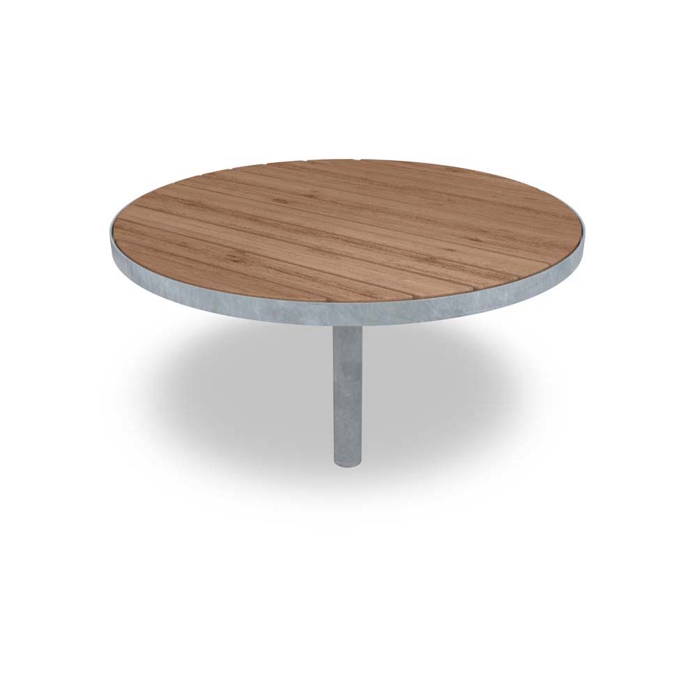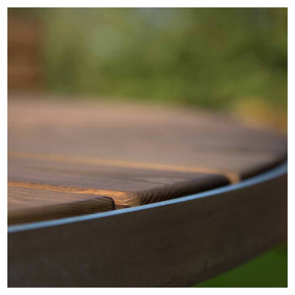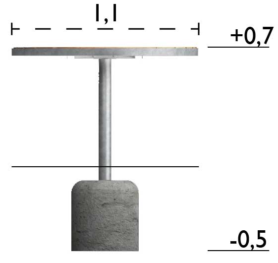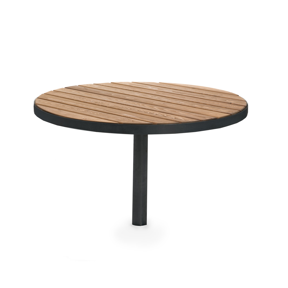 Detta runda utebord är för nedgjutning i mark och tillverkat av träskyddsbehandlat skandinaviskt furu och kan fås med en galvaniserad eller pulverlackerad svart stomme och med laserad eller värmebehandlad ytbehandling. När bordet är färdigmonterat får det en höjd på ca 70 cm och kan med fördel kombineras med andra utemöbler från Sofiero-serien. Dessa runda bord finns även i en fristående modell.