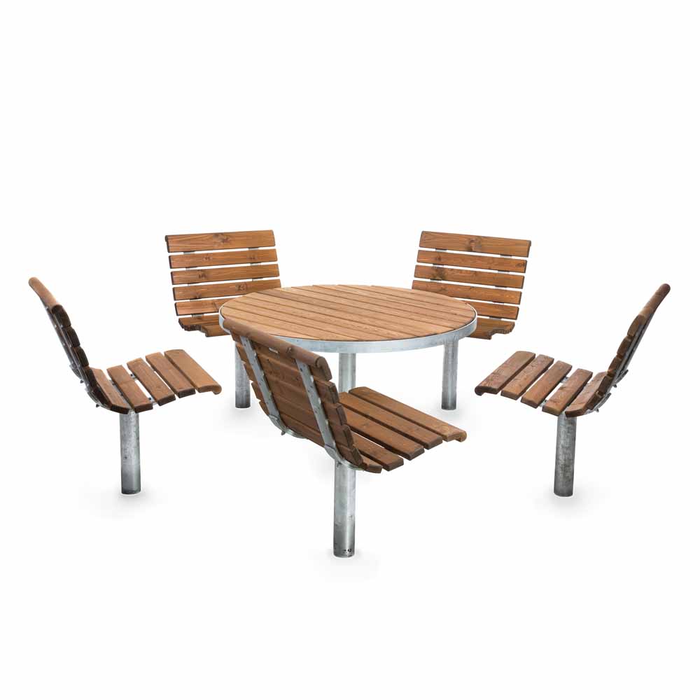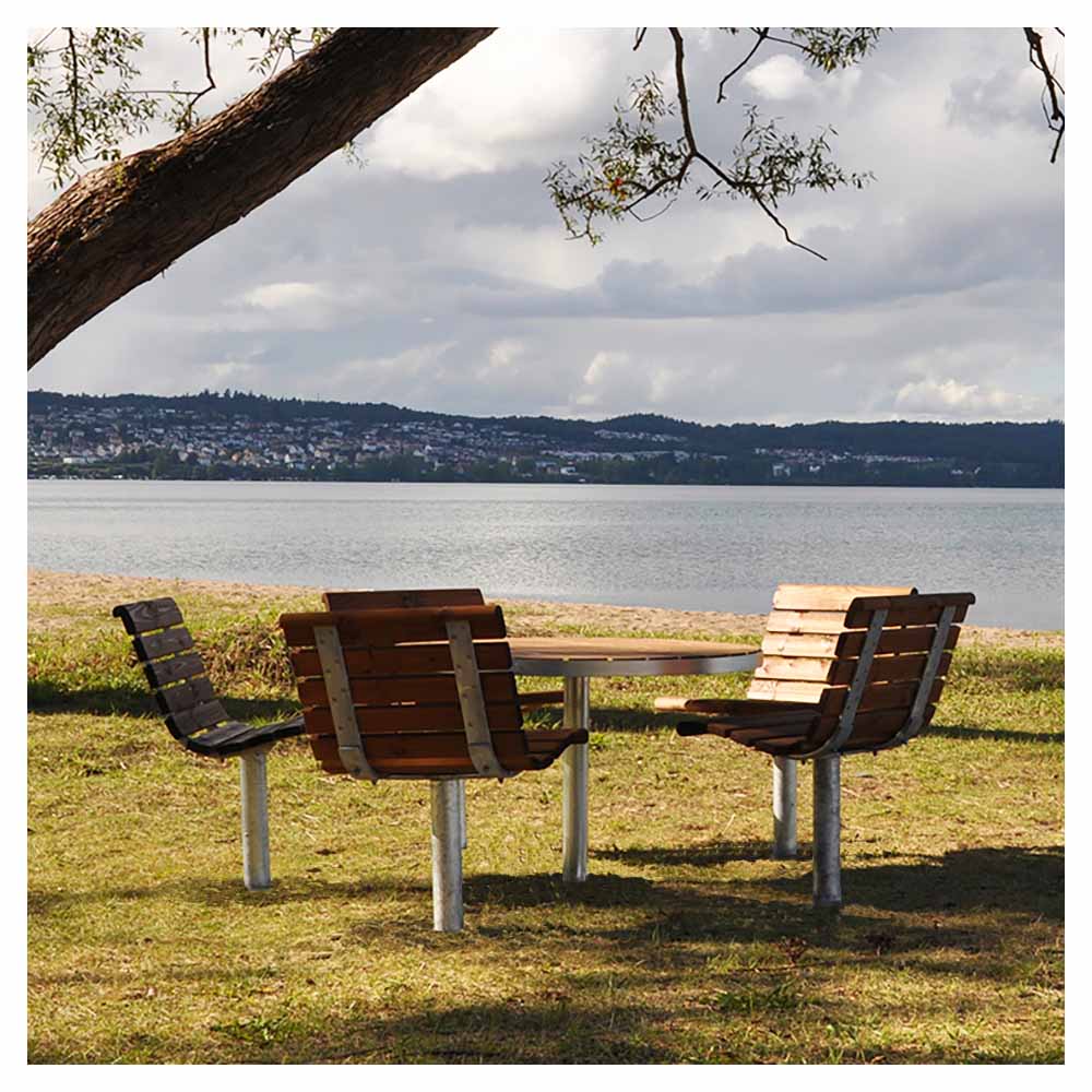 Runt bord Sofiero med en diameter på 110 cm är ett hållbart och funktionellt val när du vill placera utemöbler i parker, vid centrum, företag, skolor, BRF, hyresfastigheter och offentliga miljöer.