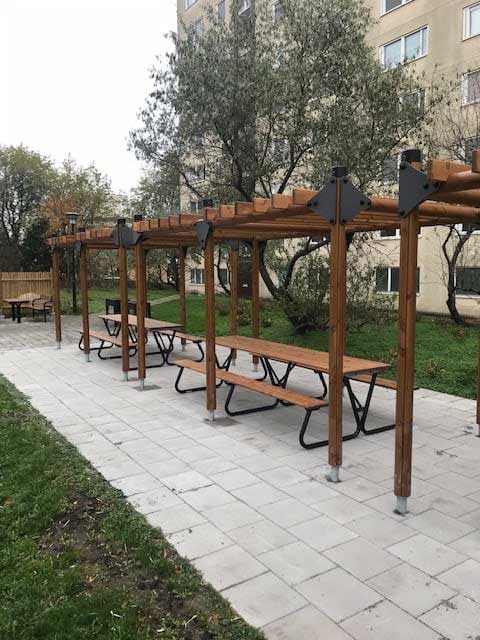 Pergola med öppna väggar och ett halvtäckande tak, har möjligheten att kläs in med klättrande växter och skapa en oas tillsammans med parksoffor och parkmöbler. Bilda ett naturligt skydd mot solens starka strålar och en samlingsplats som snabbt kommer bli populärt för många.