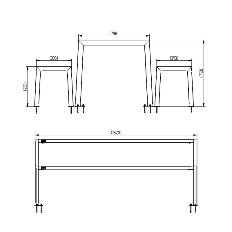 Produkten levereras i delar för montering på plats. Bottenplattor för ytmontering är fabriksmonterade på benen och säkerställer stabil infästning vid permanent installation. Produkten är avsedd för användning i offentlig utemiljö.