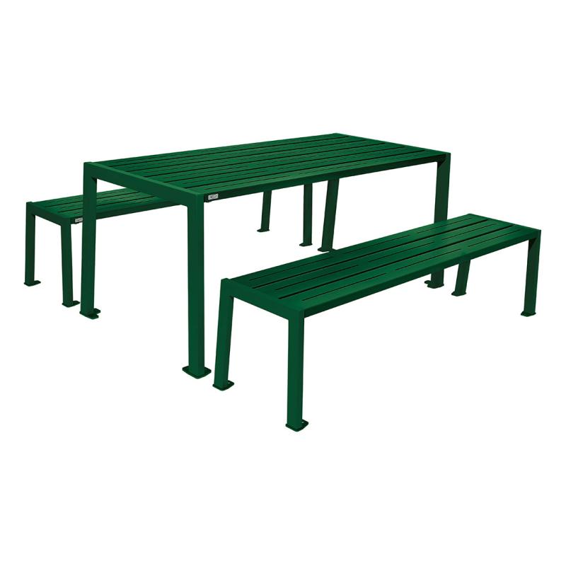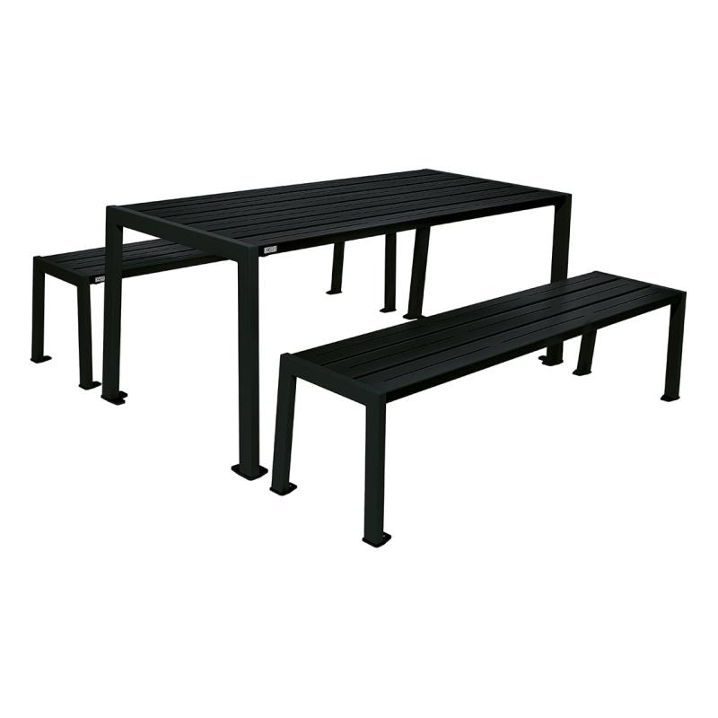 Silaos picknickbord är ett stabilt stålset med bord och två bänkar utan ryggstöd, anpassat för utemiljöer där möbler ska vara driftsäkra och kräva minimalt underhåll. Setet lämpar sig väl för bostadsområden, offentliga entréer och gemensamma ytor.