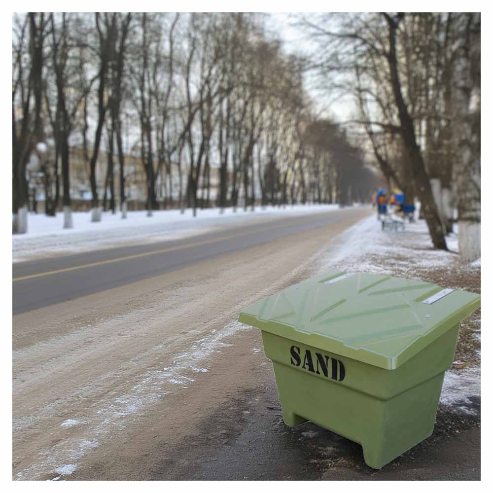 Produkten rymmer 350 liter halksand och är perfekt för att hålla gångvägar, parkeringsplatser, innergårdar, garageuppfarter och andra ytor säkra under vinterhalvåret.