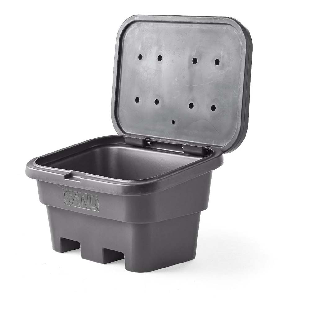 För att säkerställa att halksanden förblir torr och lättanvänd är locket designat med integrerade gångjärn och smarta luftkanaler som motverkar kondensbildning. Sandlådan väger 21 kg och kan förflyttas med truck, vilket gör den enkel att hantera och placera på gångvägar, i parker eller vid entréer oavsett användningsområde.