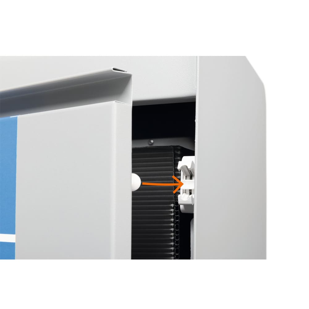 Kärlet har en stabil stomme i pulverlackerad metall och en borttagbar innerhink i plast som förenklar tömning och rengöring. Fronten är utrustad med en tryck-och-öppna-mekanism som gör det enkelt att komma åt innerkärlet vid tömning. DURASORT®-kärlet har justerbara fötter som säkerställer stabil placering även på ojämna underlag.