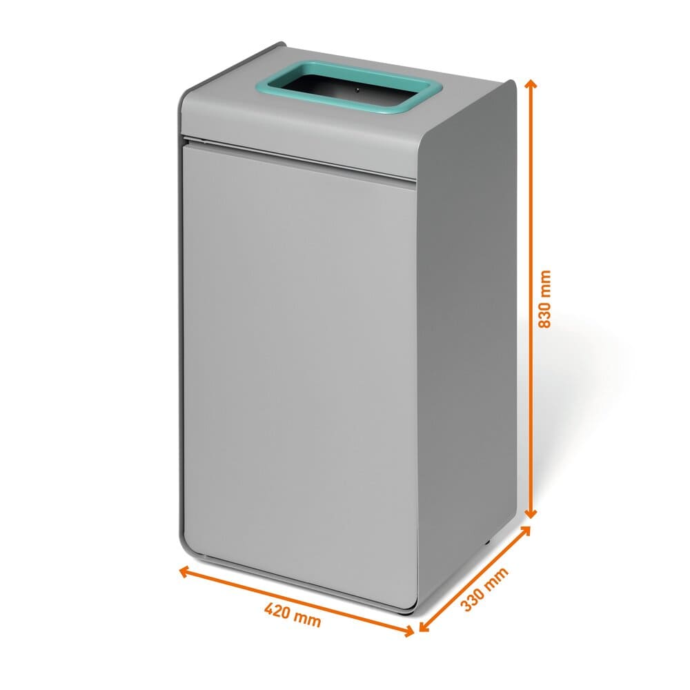 Detta återvinningskärl för glas är utformat för inomhusmiljöer där man vill kombinera tydlig källsortering med en modern färgskala. Den turkosa färgmarkeringen runt inkastet och den tydliga glassymbolen gör sorteringen enkel och intuitiv.