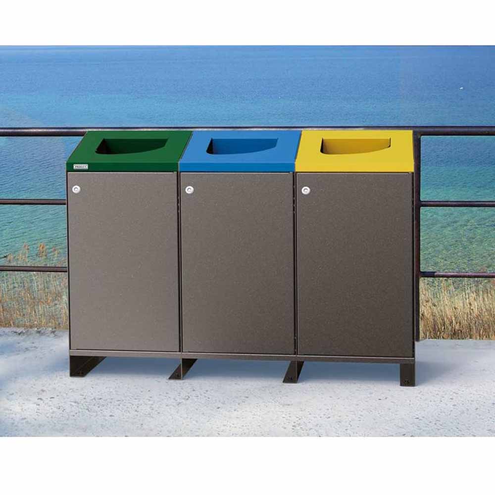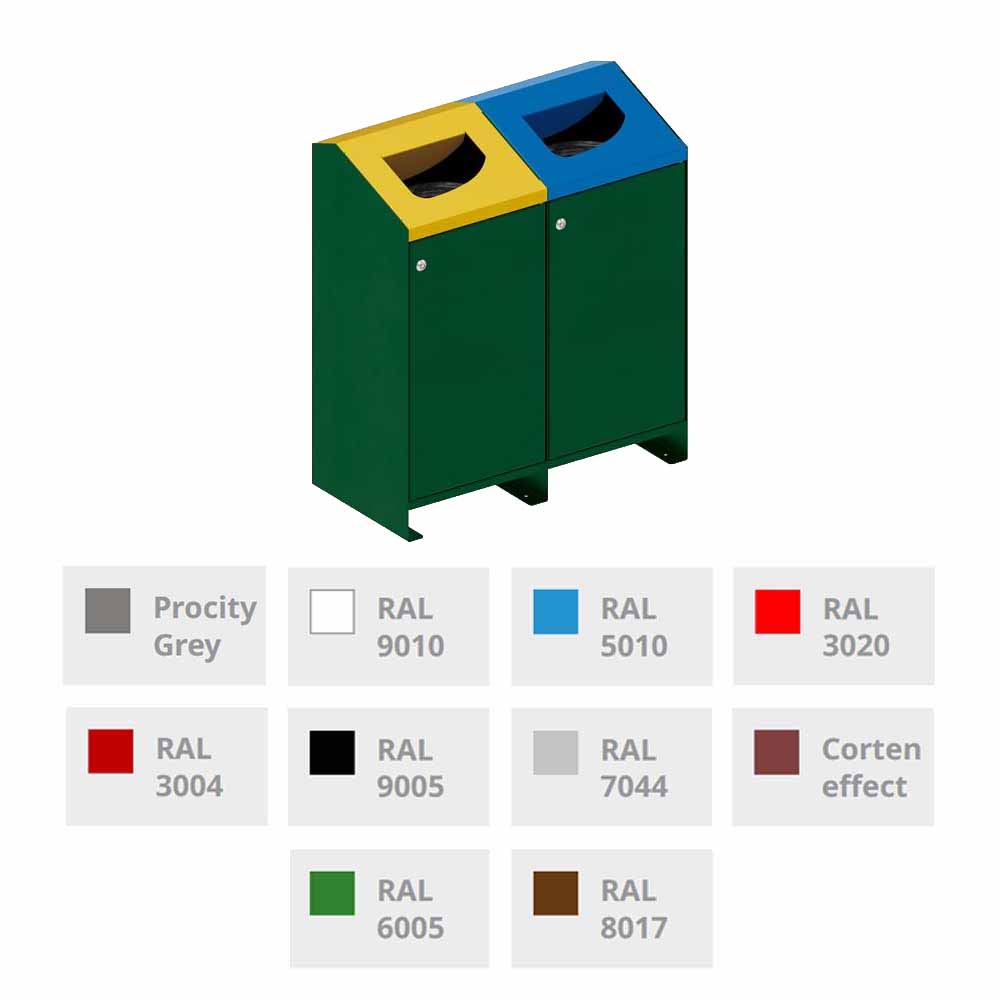 Kärlen är tillverkade i galvaniserad stålplåt med lackerad yta för att klara utomhusmiljöer under lång tid. Varje enhet rymmer en 100-literssäck och är försedd med frontöppning och trekantslås, vilket ger enkel hantering vid tömning och service.