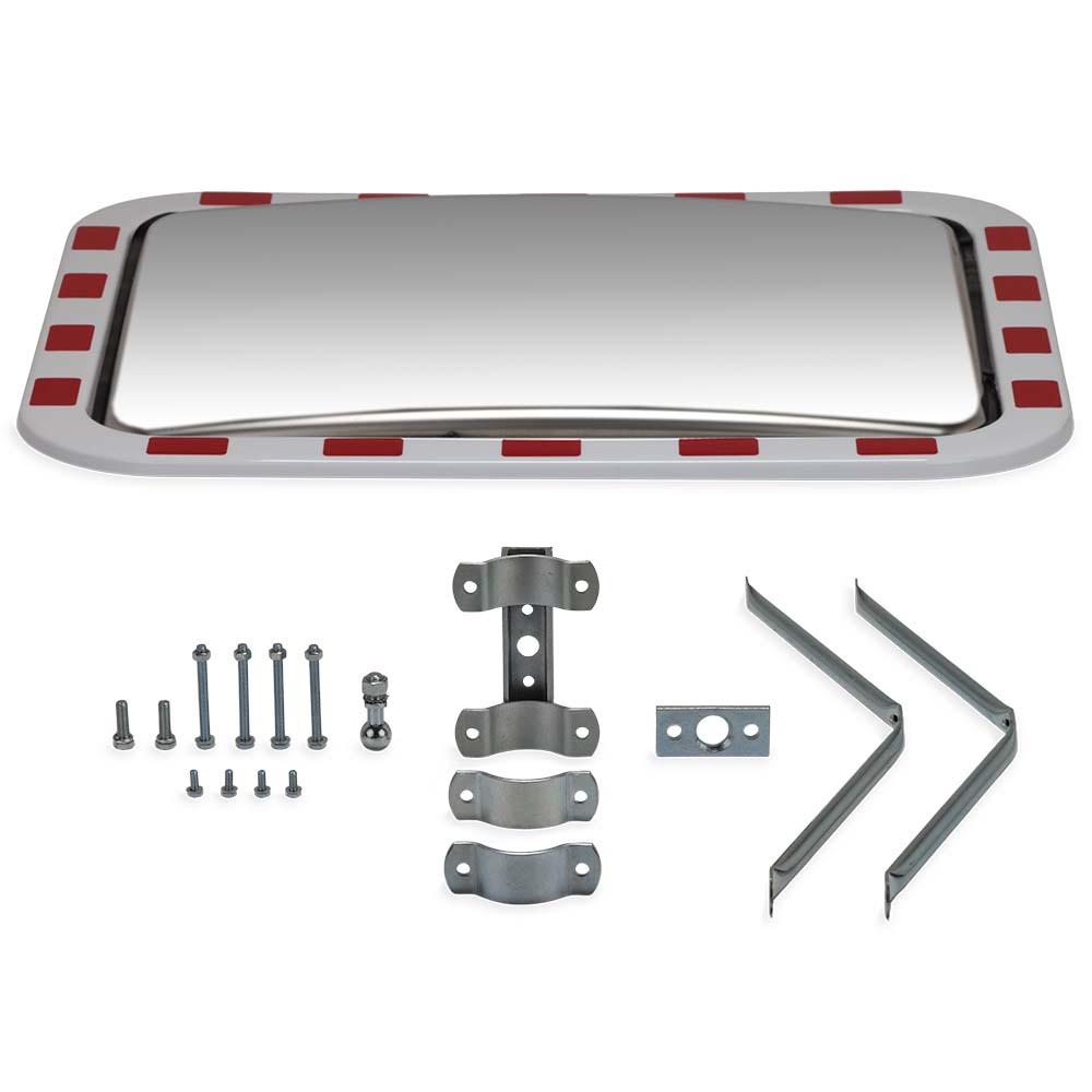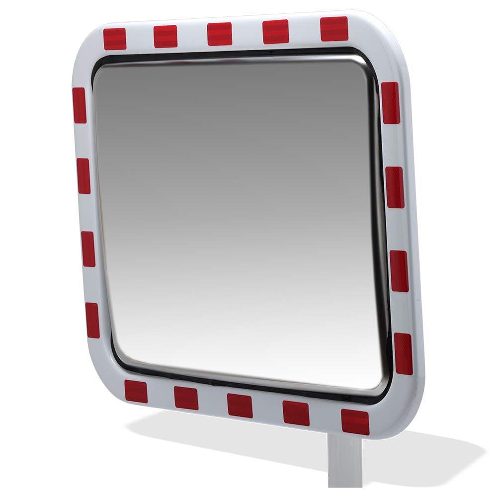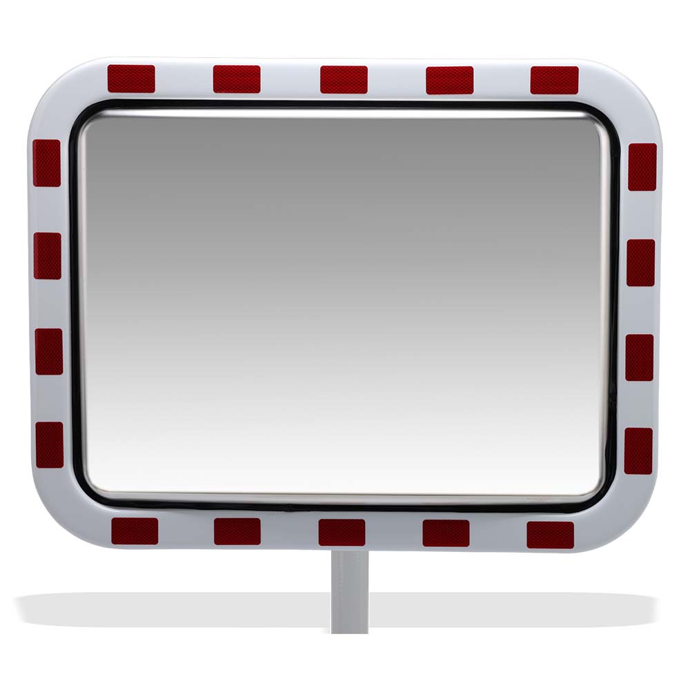 Spegelytan är tillverkad i högkvalitativt INOX-material som är UV-resistent, kemikaliebeständigt, rostfritt och extremt tåligt. Detta gör den idealisk för långvarigt utomhusbruk utan att materialet mattas av eller spricker. Ökad synlighet uppnås med den vita ramen som spegeln är utrustad med tillsammans med synliga röda reflekterande varningsfält, vilket drastiskt ökar uppmärksamheten hos trafikanter även i mörker och dålig väderlek.