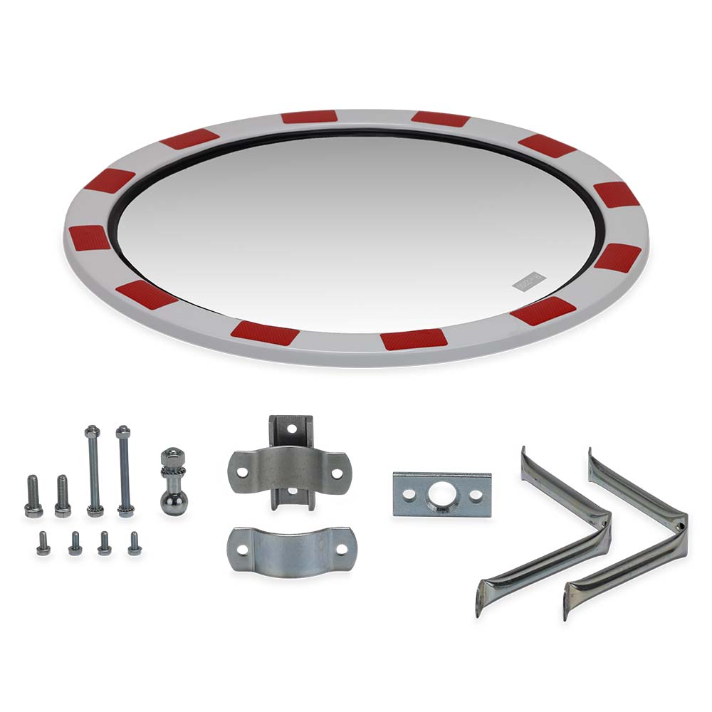 Isfri vägspegel 60cm diameter Isfri vägspegel 60cm diameter med reflexkant Baksida på isfri vägspegel 60cm diameter Monteringsdetaljer för isfri vägspegel 60cm diameter