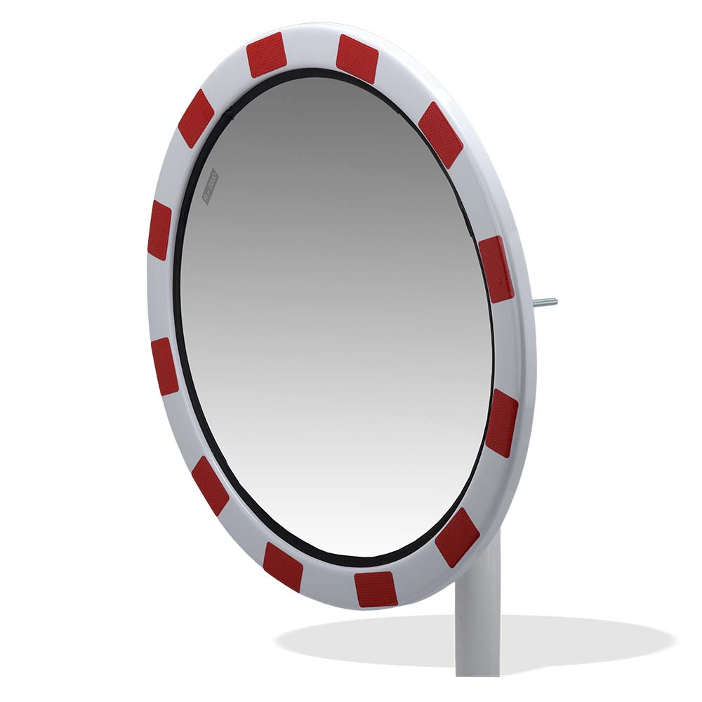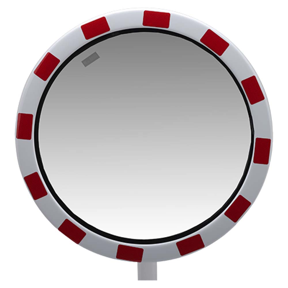 Spegelytan är tillverkad i högkvalitativt INOX-material som är UV-resistent, kemikaliebeständigt, rostfritt och extremt tåligt. Detta gör den idealisk för långvarigt utomhusbruk utan att materialet mattas av eller spricker. Ökad synlighet uppnås med den vita ramen som spegeln är utrustad med tillsammans med synliga röda reflekterande varningsfält, vilket drastiskt ökar uppmärksamheten hos trafikanter även i mörker och dålig väderlek.