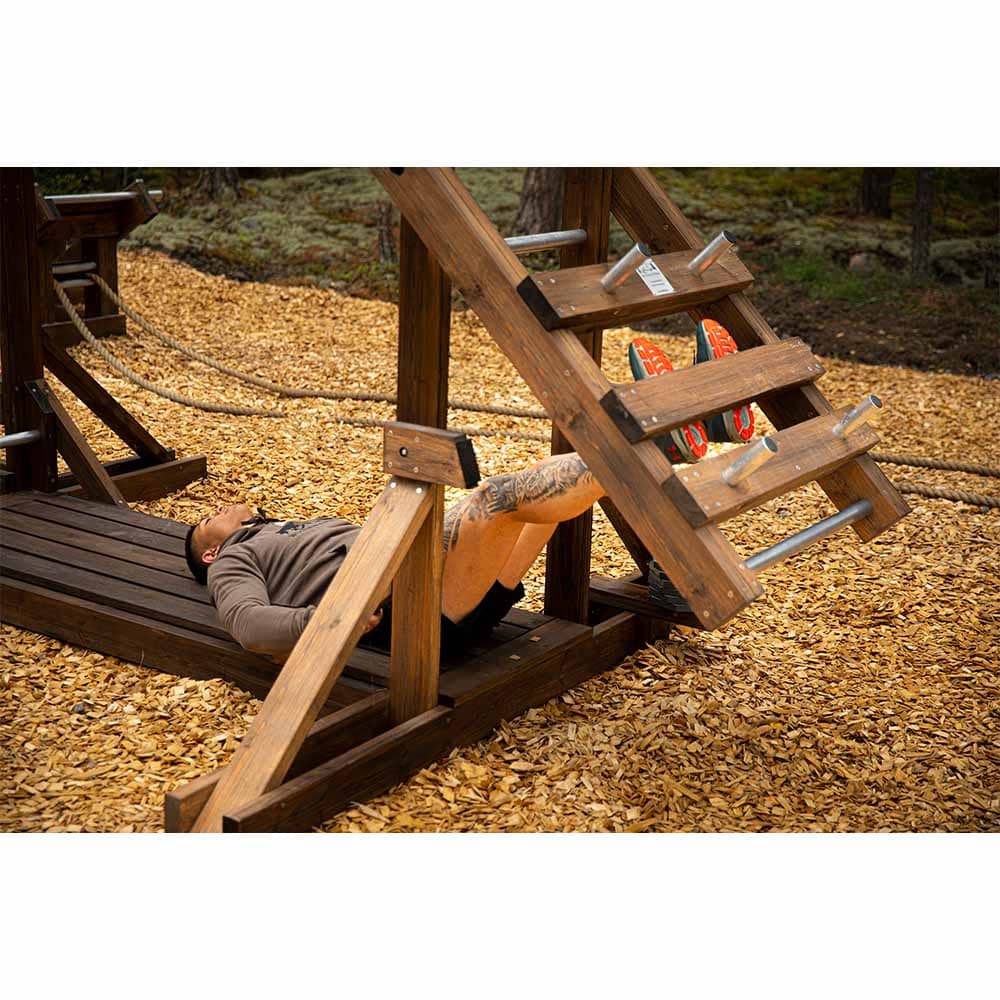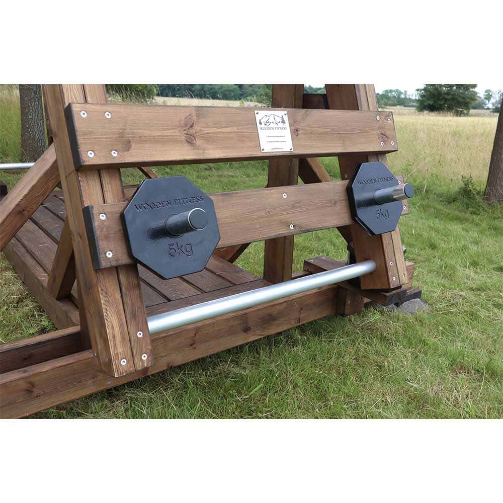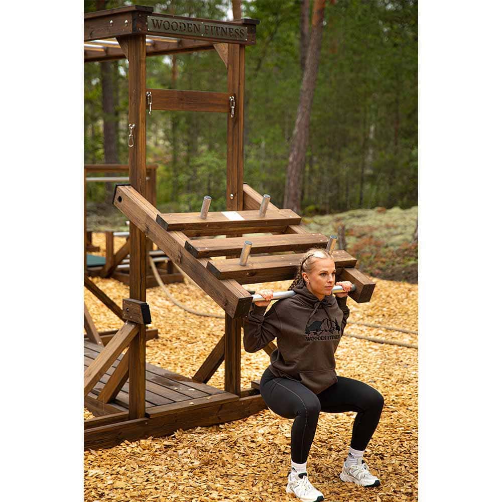 Skapa en komplett träningsstation utomhus med Kroppskraft X – ett robust utegym i trä där du kan träna med både kroppsvikt och vikter. Stationen rymmer två användare och erbjuder övningar som knäböj, utfall, rodd och axelpress. De åtta 5-kilosviktskivorna i tålig design är tillverkade i Sverige och anpassade för utomhusmiljö oavsett om det är på en innergård, ett företagsområde, parker eller träningsområden utomhus.