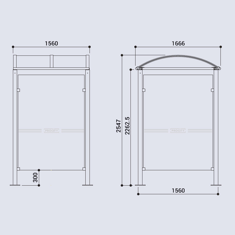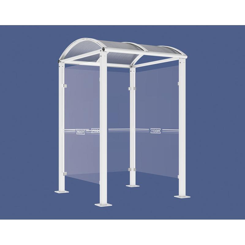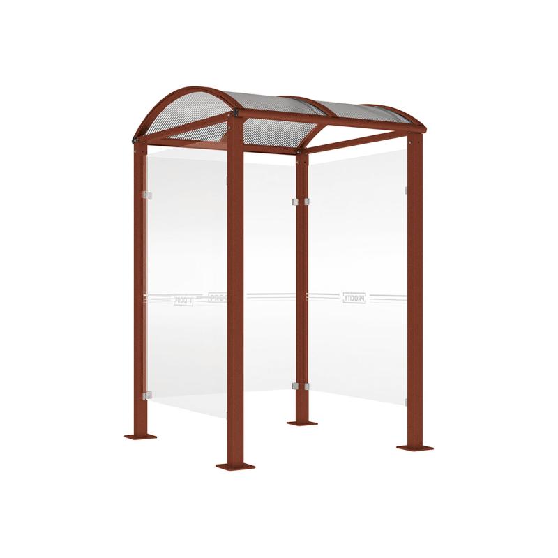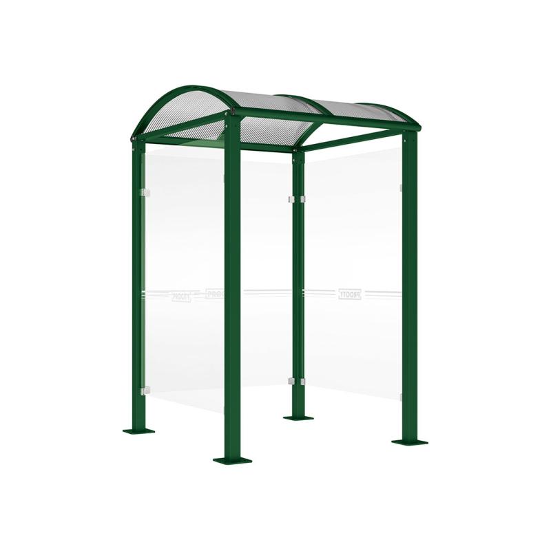 Taket är tillverkat av 6 mm UV-behandlad kanalplast i kupolform, vilket ger effektivt skydd mot väder och vind. Väderskyddets sidor består av 8 mm härdat säkerhetsglas som bidrar till både säkerhet och ett modernt uttryck. Galvaniserad och RAL-lackerad finish ger lång livslängd.