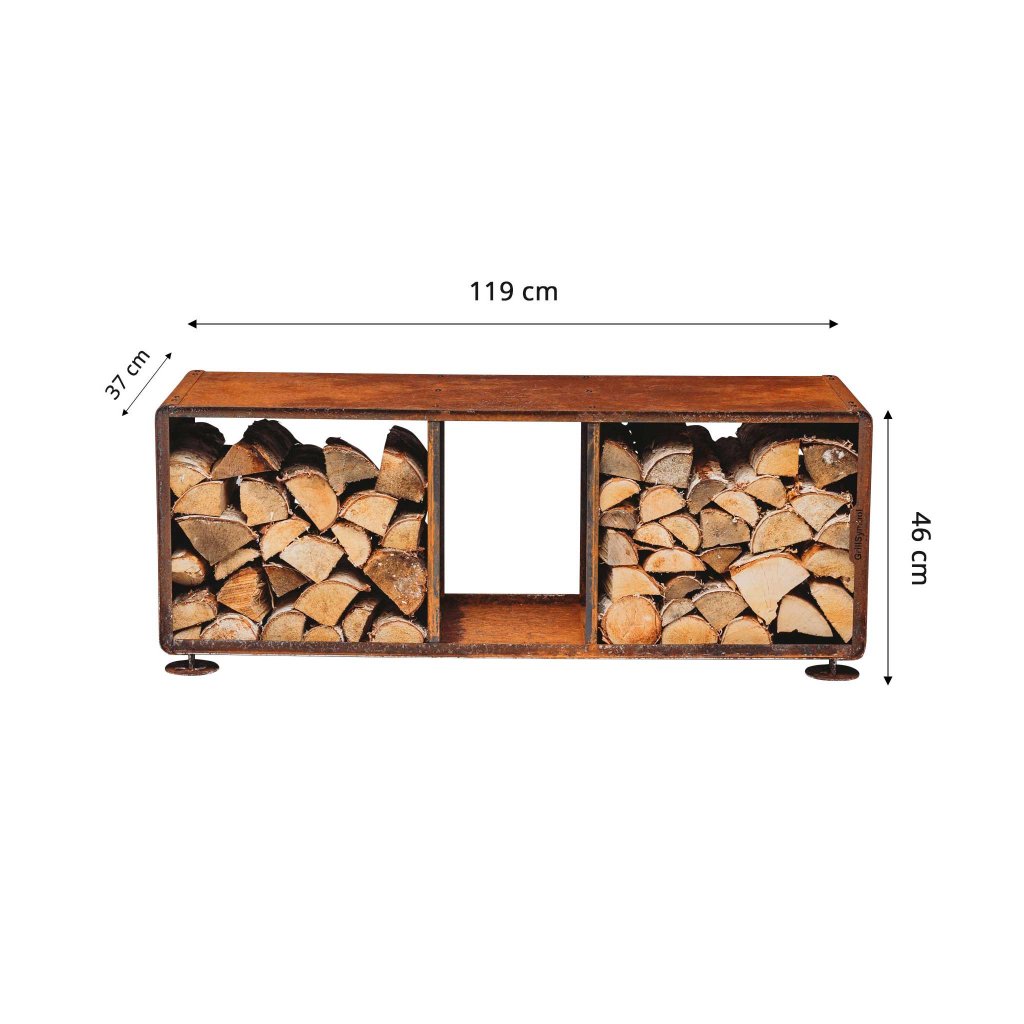 Stabil vedförvaring tillverkad av cortenstål och kan antingen användas som horisontell eller vertikal hylla. Den har tillräckligt med plats för att kunna fylla på elden flera gånger. En helt väderbeständig vedförvaring som passar både för inomhus- och utomhusbruk.