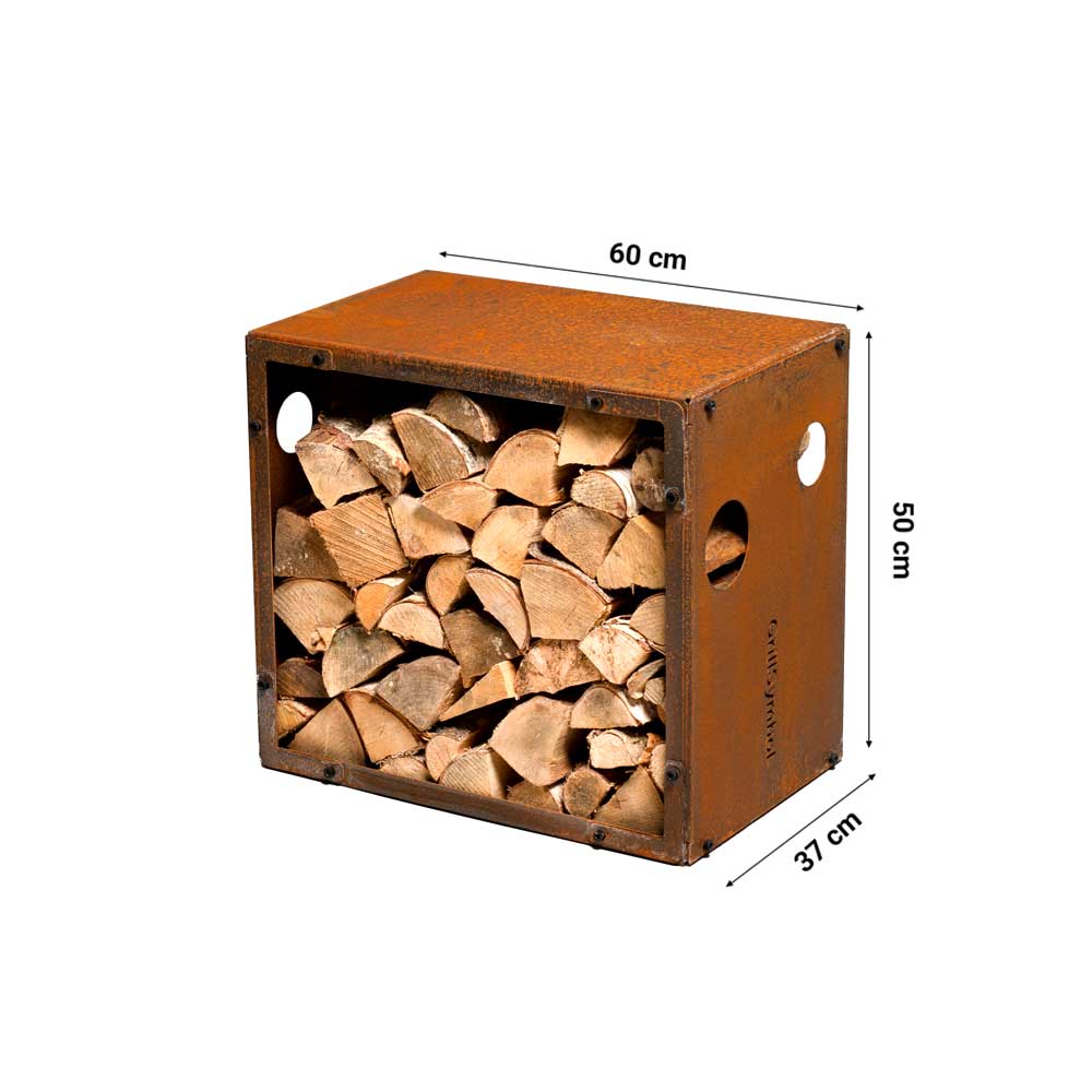 WoodStock Small vedförvaring är en attraktiv lösning för att förvara ved i och en otrolig snygg inredningsdetalj till uteplatsen. WoodStock är tillverkade av materialet cortenstål och är avsedd till att förvara ved i men kan även användas till att dela upp ytor i trädgården eller på terrassen och dekorera med växter på hyllan.
