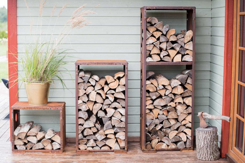 WoodStock Small vedförvaring kan monteras ihop med varandra och öppnar dörren för att kombinera hyllorna som man vill. Hyllorna i WoodStock är tillverkad av cortenstål, ett slags material som rostar trögt och får kvalitéer som underhållsfri, hållbar och klarar av slitage på ett unikt sätt som lätt uppstår med tiden. Produkter i cortenstål har en rostliknande färg och får en mörkare nyans med tiden.