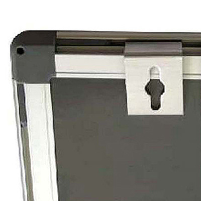 Stor anslagstavla i kork med en stilig ram i natureloxerad aluminium. I varje hörn sitter rundade svarta plasthörn för möjlighet för upphängning och förankring i vägg. Anslagstavlan kan monteras upp både på höjden och på bredden beroende på vad som passar bäst.